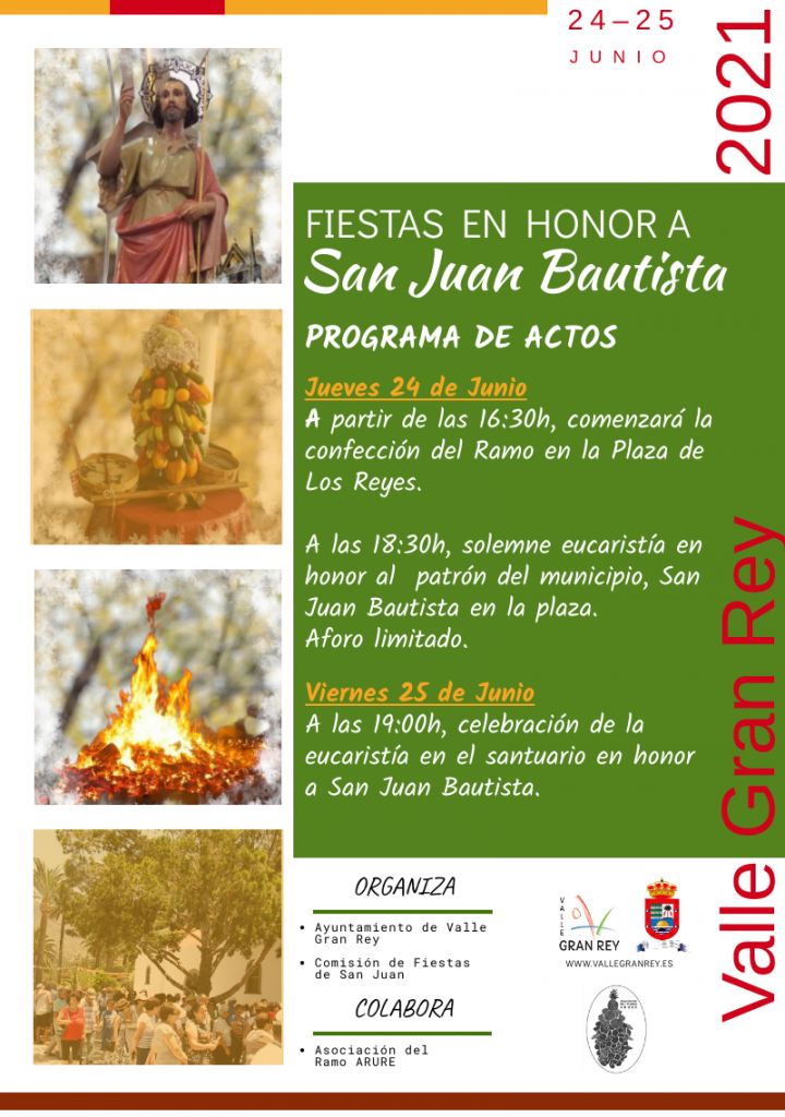 La concejalía de Fiestas y Cultura del Ayuntamiento de Valle Gran Rey, en colaboración con la Comisión de Fiestas de San Juan y la Asociación del Ramo de Arure, organizan un programa de actos con motivo de la festividad de San Juan Bautista, patrón del municipio.