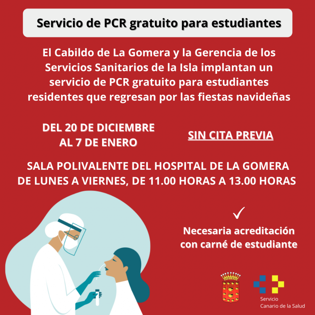 El Cabildo de La Gomera y la Gerencia de los Servicios Sanitarios de la isla han presentado, este viernes, el servicio de PCR gratuito para los estudiantes residentes que regresan por las fiestas navideñas. Se trata de una medida de control y prevención que se ha impulsado para frenar el avance de la Covid-19, especialmente, en aquellos colectivos que tienen mayor movilidad entre las islas, como es el caso del estudiantado que se forma en centros educativos en otras islas o en otros puntos del territorio europeo.