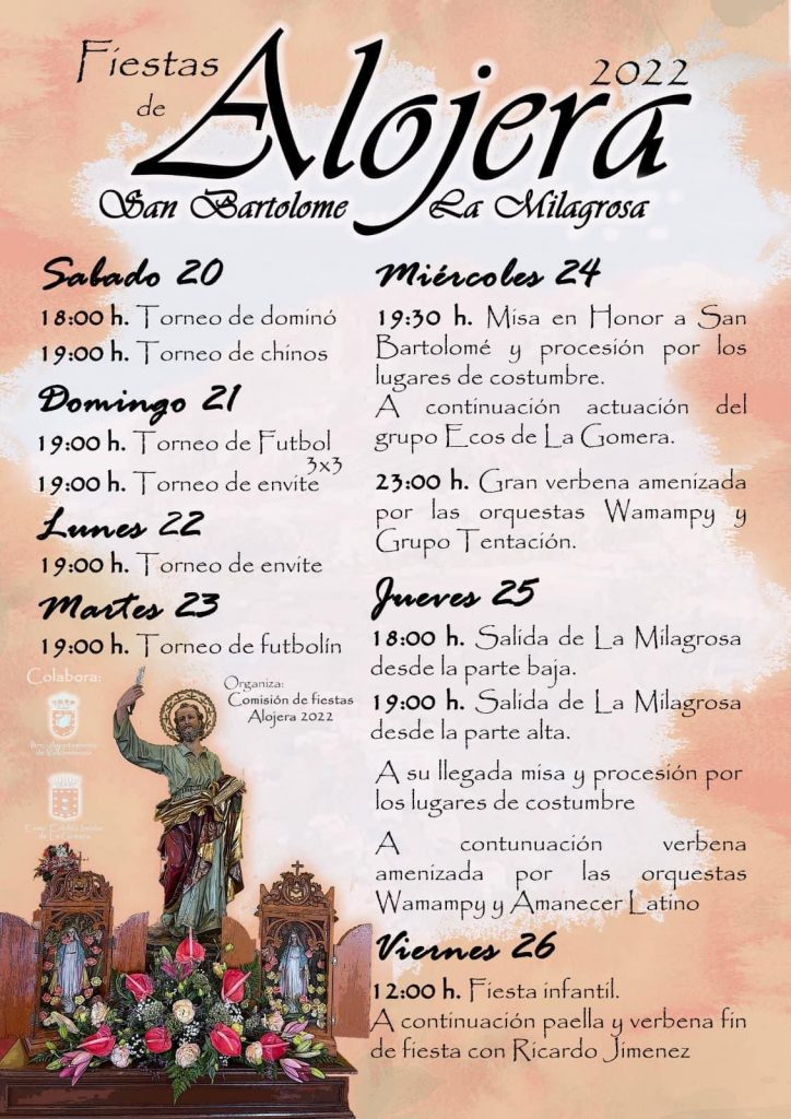Este sábado arrancan los primeros actos de las fiestas en honor a San Bartolomé y la Milagrosa en Alojera y que se desarrollarán hasta el próximo día 26. La programación, coordinada por la Comisión de Fiestas, cuenta con la colaboración del Ayuntamiento de Vallehermoso y el Cabildo Insular de La Gomera.