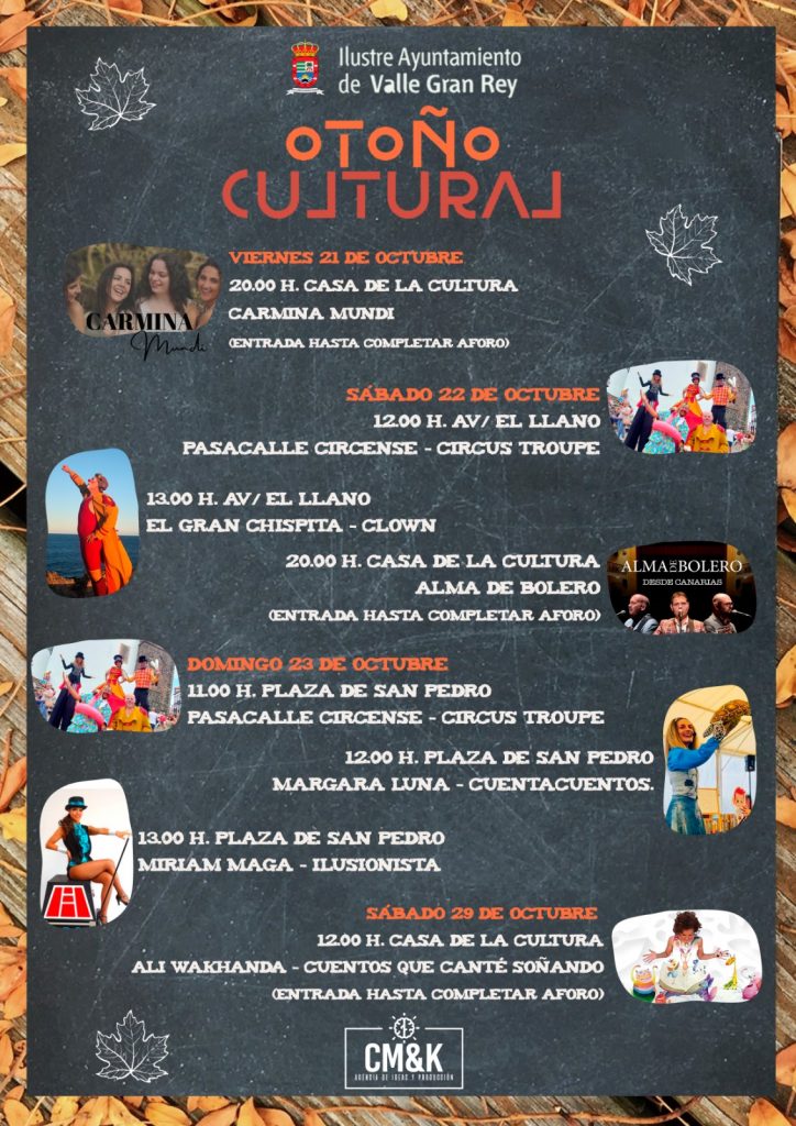 Así, la programación prevista comenzará el próximo viernes, 21 de octubre, a partir de las 20:00 horas con el espectáculo musical ‘Carmina Mundi’ en la Casa de la Cultura. Carmina Mundi significa “cantos del mundo” y engloba en un mismo espectáculo las raíces de la música mundial, con un repertorio que acerca al público palos como el folk celta, afrobeat, flamenco-fusión, son cubano, bolero, folk canario, tribal, reggae, pop y el latín jazz.