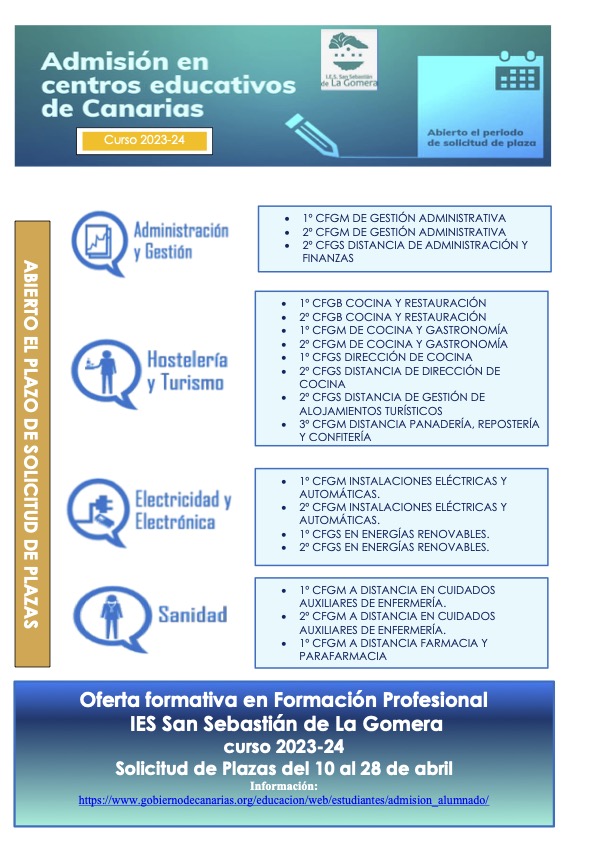 El IES San Sebastián de La Gomera hace pública la oferta formativa de la FP para el