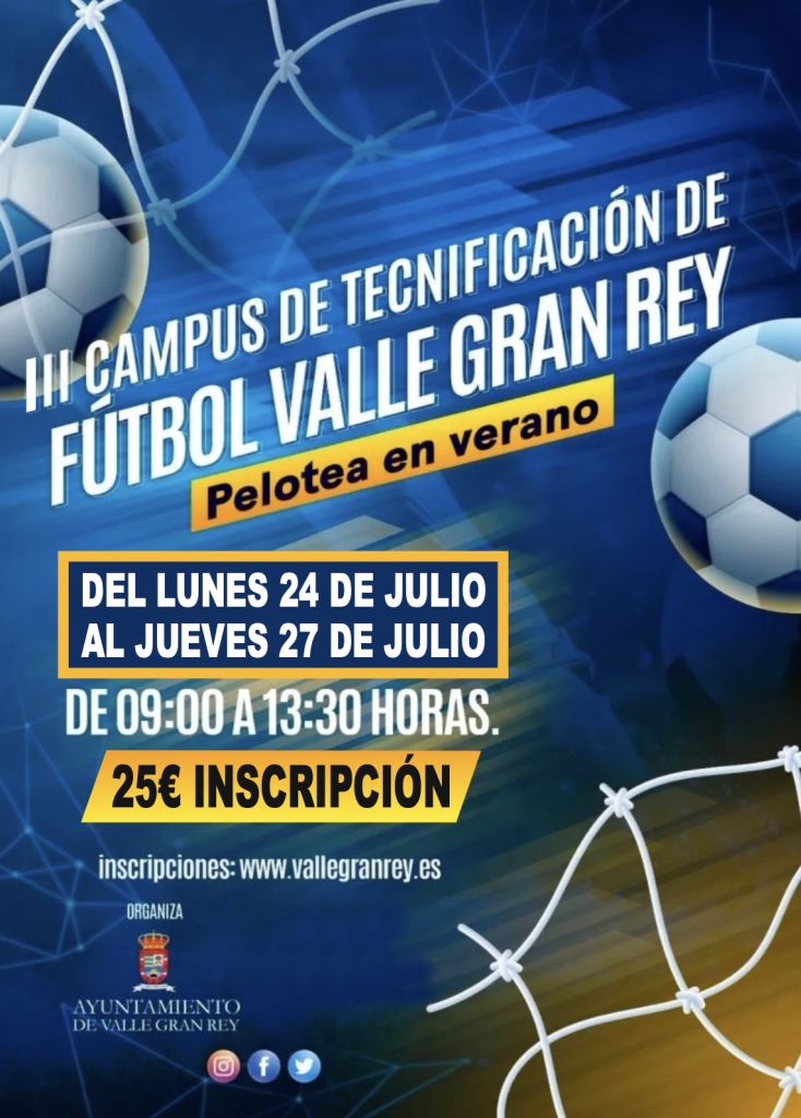 El Ayuntamiento de Valle Gran Rey ha anunciado hoy la puesta en marcha del III Campus de Tecnificación en Fútbol que se llevará a cabo en el municipio del 24 al 27 de julio en el Campo de Fútbol Municipal Playa del Inglés. “Se trata de unas jornadas puestas en marcha con el objetivo de fomentar el deporte, el aprendizaje y los valores deportivos entre los más jóvenes, haciendo que se diviertan durante estos días de verano”, explica el concejal de Deportes del municipio, Walter Martín.