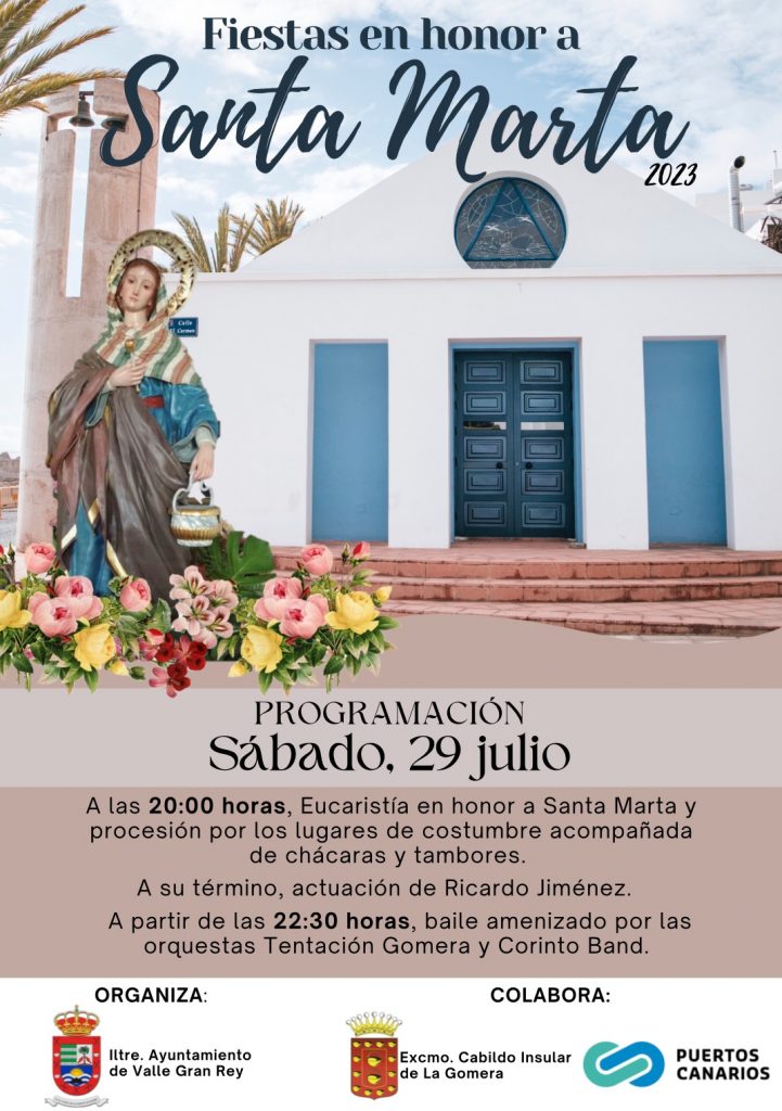 El Ayuntamiento de Valle Gran Rey ha presentado hoy el programa de actos con motivo de las fiestas en honor a Santa Marta, que se celebran en el municipio el próximo sábado, 29 de julio. Así, los actos incluidos en la programación comenzarán a partir de las 20:00 horas con la celebración de la Eucaristía y procesión por los lugares de costumbre, acompañada de chácaras y tambores.