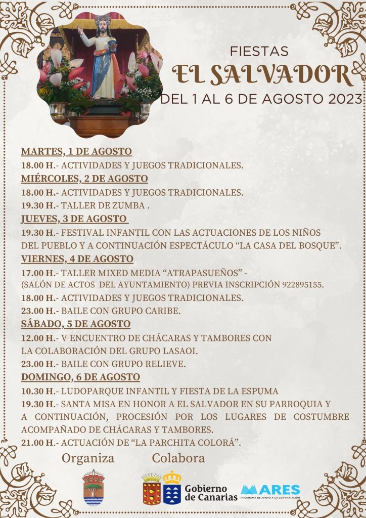 Este mismo domingo a las 19:30 horas tendrá lugar la Misa en honor a El Salvador en su parroquia y a continuación se desarrollará la procesión por los lugares de costumbre acompañado de chácaras y tambores.