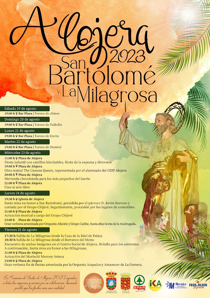 Los actos, organizados por la Comisión de Fiestas Alojera 2023, cuentan con la colaboración del Ayuntamiento de Vallehermoso, Cabildo Insular, Spar La Gomera, Garden Ika, Morales congelados, frutas y verduras, y Fred Olsen.