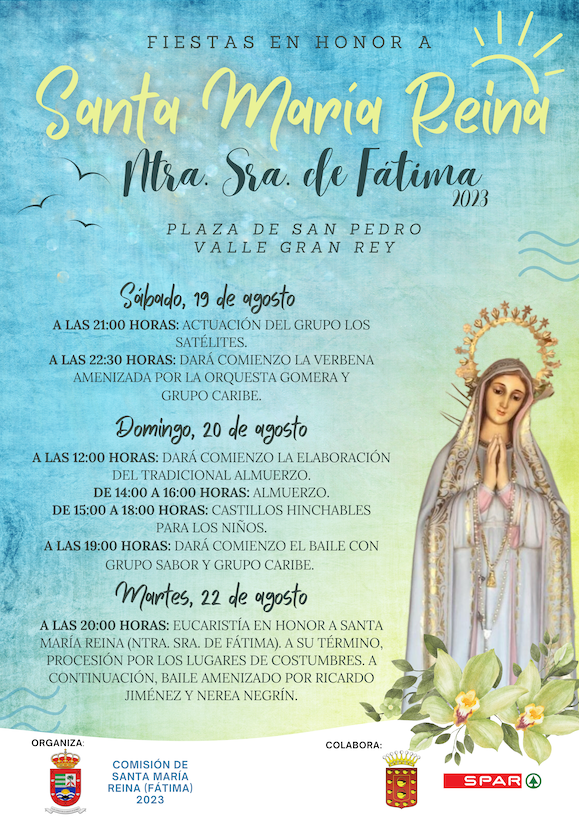 El Ayuntamiento de Valle Gran Rey ha presentado hoy el programa de actos con motivo de las Fiestas en honor a Santa María Reina (Ntra. Sra. De Fátima) que se celebran en la Plaza De San Pedro, los días 19, 20 y 22 de agosto.