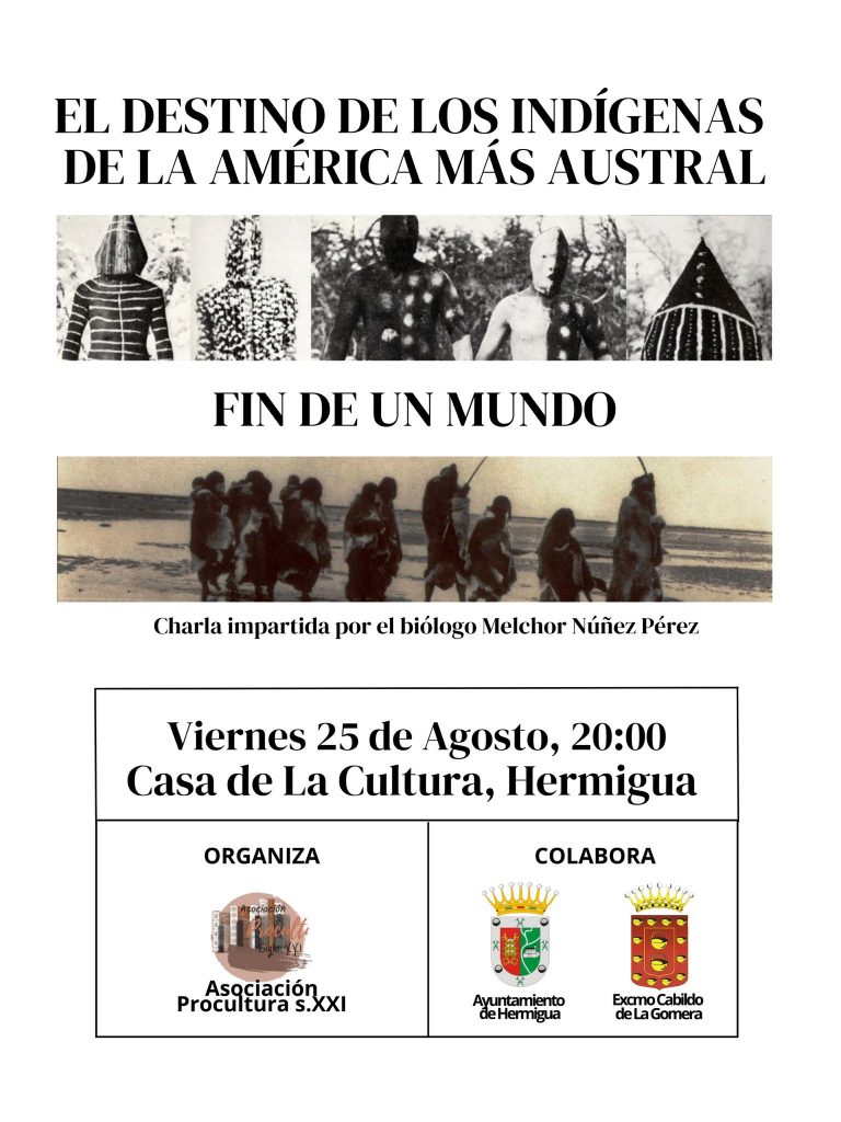 El próximo viernes, 25 de agosto, a las 20:00 horas, tendrá lugar en la casa de la Cultura de Hermigua, la charla titulada «El destino de los indígenas de la América más austral. Fin de un mundo». Esta región, formada por la zona sur de la Patagonia Chilena y Argentina y que incluye la Tierra del Fuego, estaba habitada por cinco grupos o comunidades humanas  a la llegada, a comienzos del siglo XVI, de los primeros europeos. Se trataba de pueblos cazadores, pescadores y recolectores de productos vegetales de los que se alimentaban. Se habían adaptado a las duras condiciones climáticas de su entorno. La primera referencia europea de esos pueblos la obtuvo la expedición de Fernando de Magallanes. La colonización europea efectiva de aquellos lejanos e inhóspitos territorios se demoró hasta el siglo XIX. Desde entonces, y en el plazo de las pocas décadas transcurridas hasta los comienzos del siglo XX, fueron sometidos a persecución, aculturación y exterminio, lo que condujo a la desaparición de muchos de ellos y de sus culturas.  Dada la cercanía temporal de estos sucesos, existen numerosos testimonios e imágenes fotográficas de todo ello y de la gente que los sufrió. Se tiene conocimiento de sus costumbres, sus creencias y su modo de vida. Tal conocimiento ha permitido, a su vez, comprender mejor cómo fue el poblamiento inicial del continente americano y establecer comparaciones con lo sucedido en otras latitudes, incluida la nuestra.