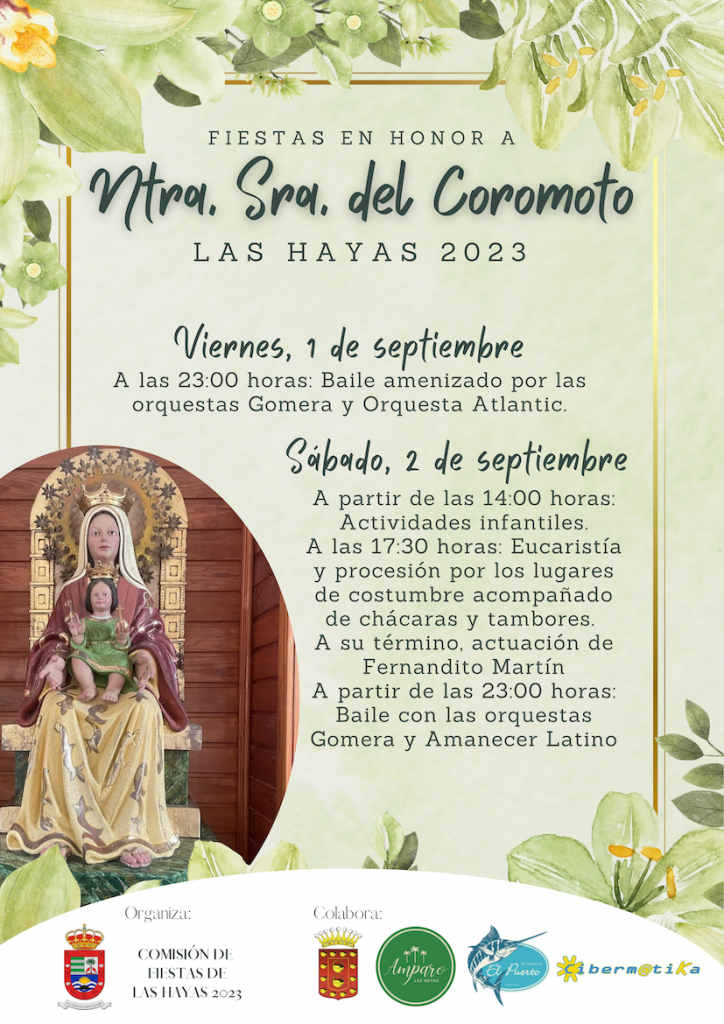 El Ayuntamiento de Valle Gran Rey presenta el programa de actos con motivo de las fiestas en honor a Ntra. Sra. del Coromoto que se celebran en Las Hayas los próximos 1 y 2 de septiembre.