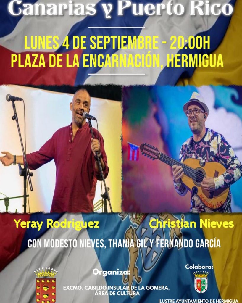 Hoy, lunes 4 de septiembre, en la Plaza de La Encarnación de Hermigua, a las 20.00 horas, tendrá lugar la actuación musical ‘Puerto Rico & Canarias’ con la participación de los artistas puertorriqueños Christian Nieves y Modesto Niveles, y los canarios Thania Gil, Fernando García y Yeray Rodríguez.
