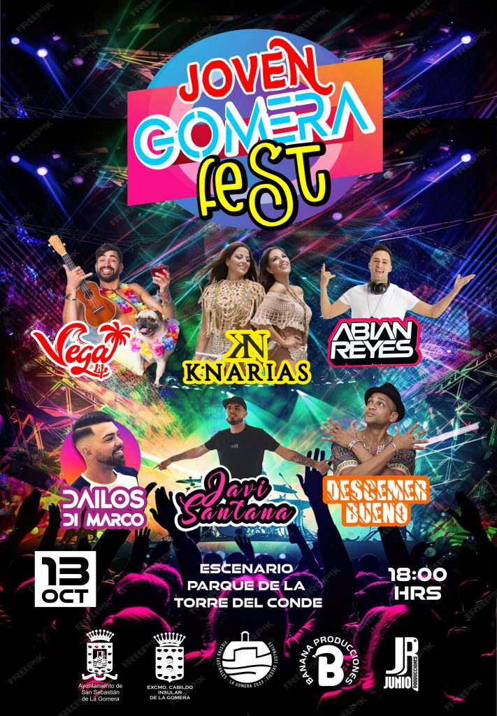 El Joven Gomera Fest contará con las actuaciones de DJ Abián Reyes y DJ Dailos Di Marco, Javi Santana, Descemer, El Vega Life y las K-Narias. Este concierto joven se celebra el viernes 13 de octubre, a partir de las 18.00 horas y las puertas del recinto del Parque de la Torre del Conde se abrirán desde las 16.30 horas.