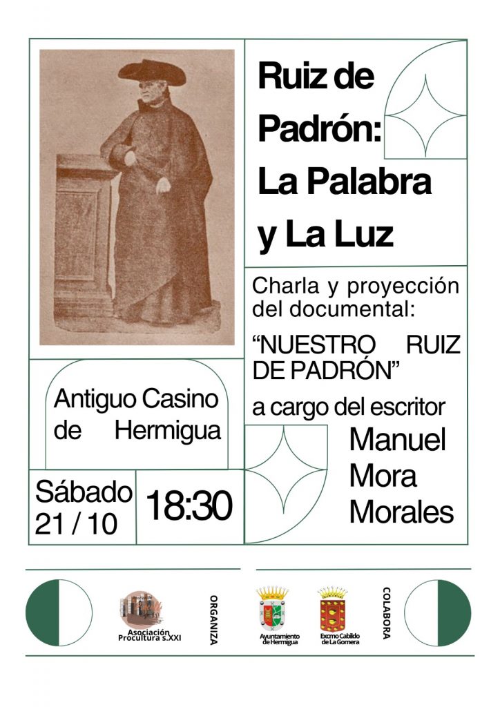 El próximo sábado 21 de octubre, a las 18:30 horas, en el Antiguo Casino de Hermigua, tendrá lugar la proyección de la película “Nuestro Ruiz de Padrón” (30 minutos de duración) y la charla titulada “Ruiz de Padrón: la luz y la palabra”, impartida por el escritor y cineasta Manuel Mora Morales.