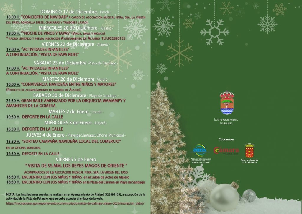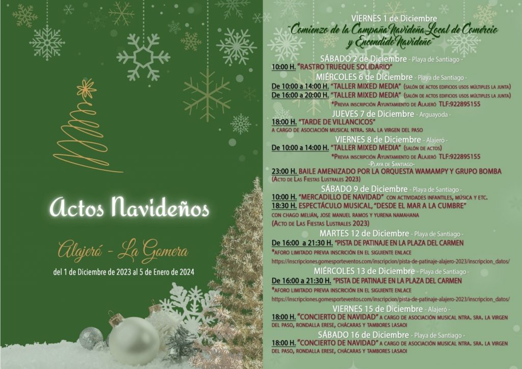 El viernes, 22 de diciembre a las 17:00 horas darán comienzo diversas actividades infantiles en Alajeró y a continuación se recibirá la visita de PAPÁ NOEL Misma actividad y a la misma hora en Playa de Santiago el sábado, 23 de diciembre.