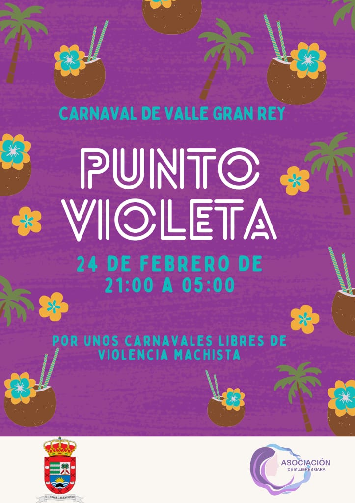 El Ayuntamiento de Valle Gran Rey ha puesto en marcha, a través de la Asociación de Mujeres Gara, la activación de un ‘Punto Violeta’ que se ubicará en el Puerto de Vueltas, durante este sábado 24 de febrero, con motivo de la celebración de la verbena del Carnaval de Valle Gran Rey.