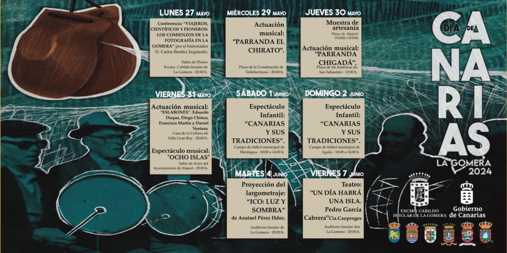 Un día después, el 31 de mayo, la programación contempla el espectáculo ‘Ocho islas’a las 20:00 horas en el Salón de Actos del Ayuntamiento de Alajeró. Y a la misma hora será la actuación musical de ‘Eslabones’ con Eduardo Duque, Diego Chinea, Francisco Martín y Daniel Ventura en la Casa de la Cultura de Valle Gran Rey.