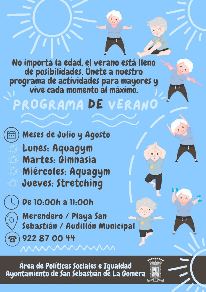 El Ayuntamiento de San Sebastián de La Gomera, a través de la Concejalía de Políticas Sociales, pone en marcha la programación deportiva y de ocio destinada a las personas mayores del municipio. Sin necesidad de inscripción previa y de forma gratuita, se ofrecen actividades de aquagym, gimnasia y stretching que se desarrollarán en la Playa de San Sebastián y en el Audillón de La Gomera, de lunes a jueves durante los meses de julio y agosto.
