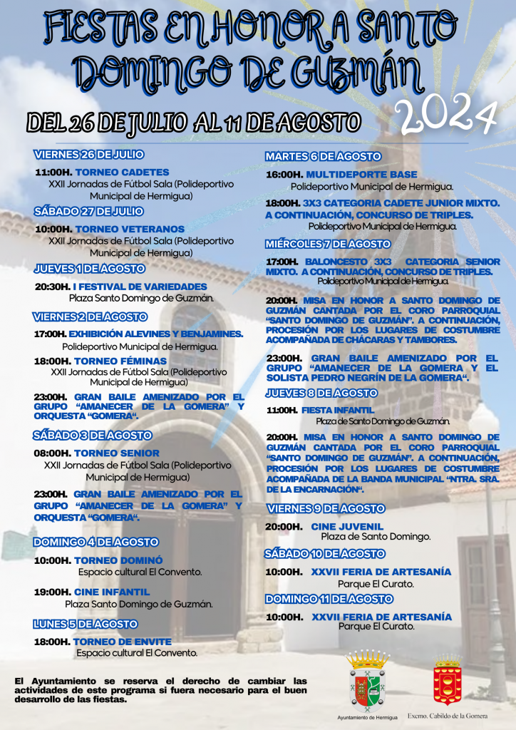 El Área de Cultura y Fiestas del Ayuntamiento de la Villa norteña de Hermigua, en La Gomera, ha dado a conocer en el día de hoy, todo el contenido de Actos y Eventos que se desarrollarán en la localidad en las próximas semanas con motivo de la celebración de la primera de sus dos Fiestas Patronales y que, en esta ocasión, corresponden a las que honrarán a Santo Domingo de Guzmán.