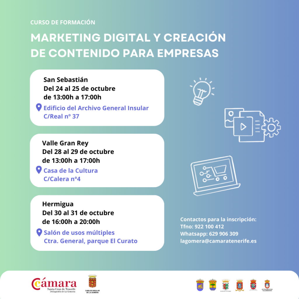 El Cabildo de La Gomera y la delegación de la Cámara de Comercio de Santa Cruz de Tenerife en La Gomera ofrecen un curso formativo de marketing digital y creación de contenido para empresas. La formación, de carácter gratuito, se desarrollará durante este mes de octubre en sesiones presenciales en San Sebastián, Valle Gran Rey y Hermigua, y están dirigidas a cualquier tipo de negocio con actividad en la isla.