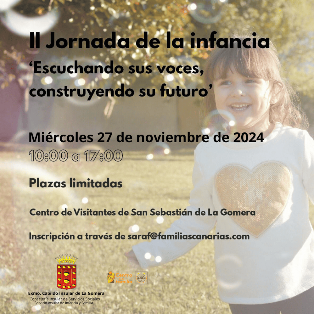 La Gomera celebra, el próximo miércoles, 27 de noviembre, la II Jornada de la Infancia y la Adolescencia, en el Centro de Visitantes de San Sebastián. Se trata de un evento promovido por el Cabildo insular y el Centro de La Familia, a través del programa INFACAM , en el que se pretende divulgar, interiorizar y debatir algunas de las cuestiones que atañen a la Convención de los Derechos del Niño.