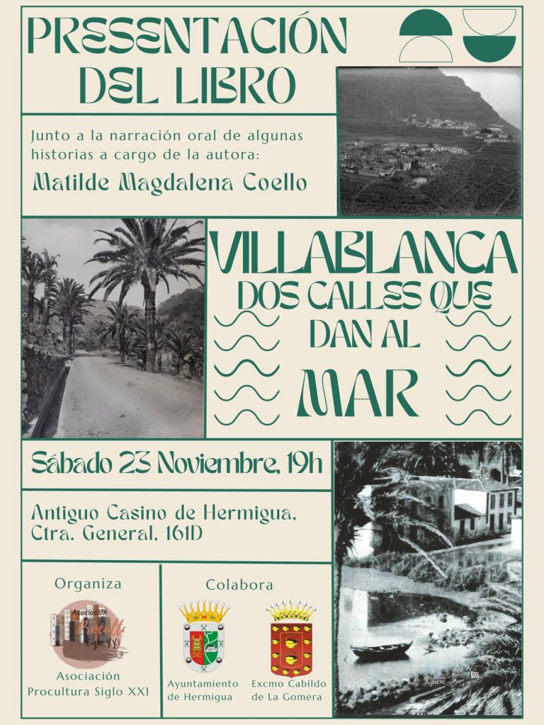 El próximo sábado, día veintitrés de noviembre, a las siete de la tarde, en el Antiguo Casino de Hermigua, tendremos ocasión de asistir a una presentación teatralizada del libro titulado «Villablanca, dos calles que dan al mar». Se trata de un interesante libro de relatos, donde se mezcla la realidad y la ficción, basados en las vivencias de aquellos que habitaron estos lugares unos años antes que nosotros. Las tradiciones de San Juan, la brujería, el contrabando, la represión franquista o la emigración clandestina son el trasfondo en el que evolucionan acontecimientos y personajes, conservados en la memoria femenina. Realidad y ficción, historia y mito se dan la mano en un cuadro que evoca el espíritu del realismo mágico.