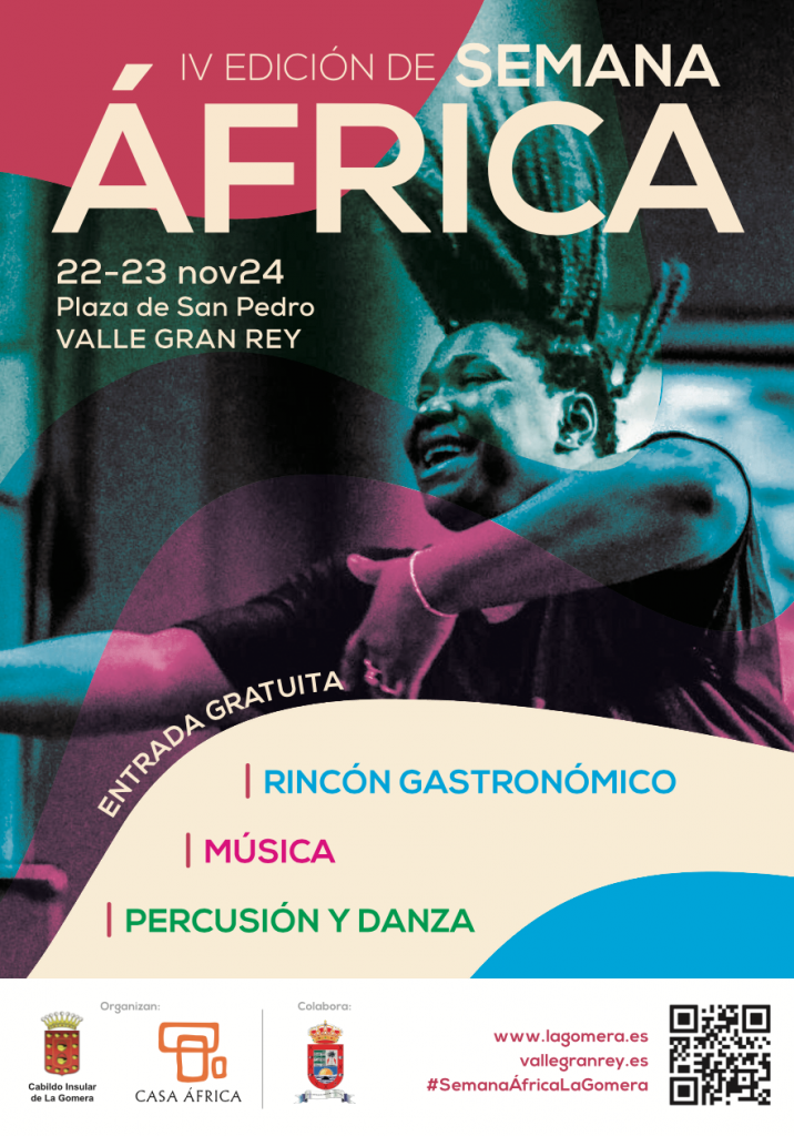 La cuarta edición de ‘Semana África’ desarrolla su actividad en La Gomera los días 22 y 23 de noviembre, en la Plaza de San Pedro de Valle Gran Rey. Así, la programación de este evento, promovido en el marco de cooperación suscrito entre el Cabildo insular y Casa África, y con la colaboración del Ayuntamiento del municipio, cuenta con una programación que incluye talleres de danza y percusión, rincón gastronómico, y música africana.