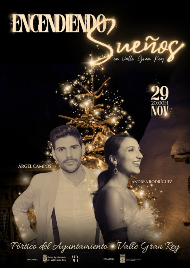El municipio de Valle Gran Rey da inicio a la época navideña con la celebración del evento ‘Encendiendo Sueños en Valle Gran Rey’, que se llevará a cabo el próximo 29 de noviembre en el pórtico del Ayuntamiento, a partir de las 20:00 horas. “Se trata de un evento muy especial, que contará con la actuación de los artistas canarios Andrea Rodríguez y Árgel Campos, con el que pretendemos dar por inaugurada una de las épocas más especiales del año, la Navidad”, explica la concejal de Comercio, Ariana Mesa. “Durante la celebración de este evento, en el que se llevará a cabo el encendido oficial de las luces de Navidad en nuestro municipio, podremos disfrutar de la música, en un ambiente muy navideño”, señala.