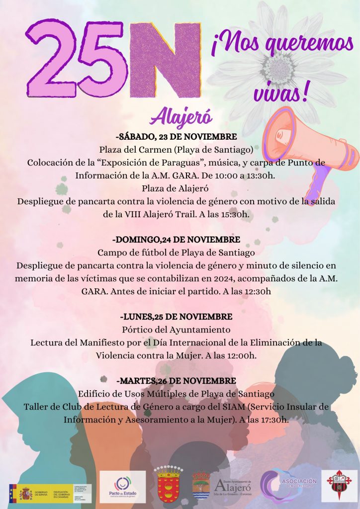 El municipio de Alajeró conmemora durante el próximo sábado, 23 de noviembre, domingo, lunes y martes, 24, 25 y 26 de noviembre respectivamente el Día Internacional contra la Violencia de Género bajo el eslogan ‘Nos Queremos Vivas’ con una serie de actos que vienen marcados por el compromiso de esta localidad sureña contra todas las circunstancias que rodean este tipo de violencia en la sociedad y especialmente en las mujeres.
