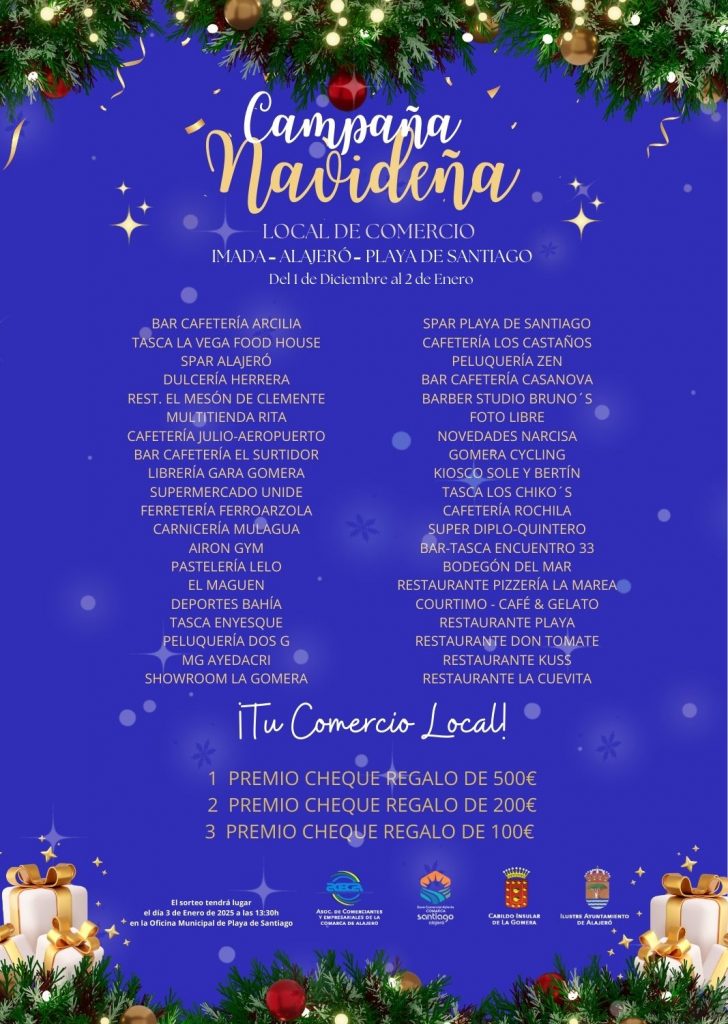 El municipio de Alajeró dará comienzo a partir del 1 de diciembre y hasta el próximo 2 de enero de 2025 con la Campaña Navideña Local de Comercio. Una iniciativa que ya lleva celebrándose desde hace varios años potenciando el consumo en establecimientos de Playa de Santiago, Imada y el casco municipal.