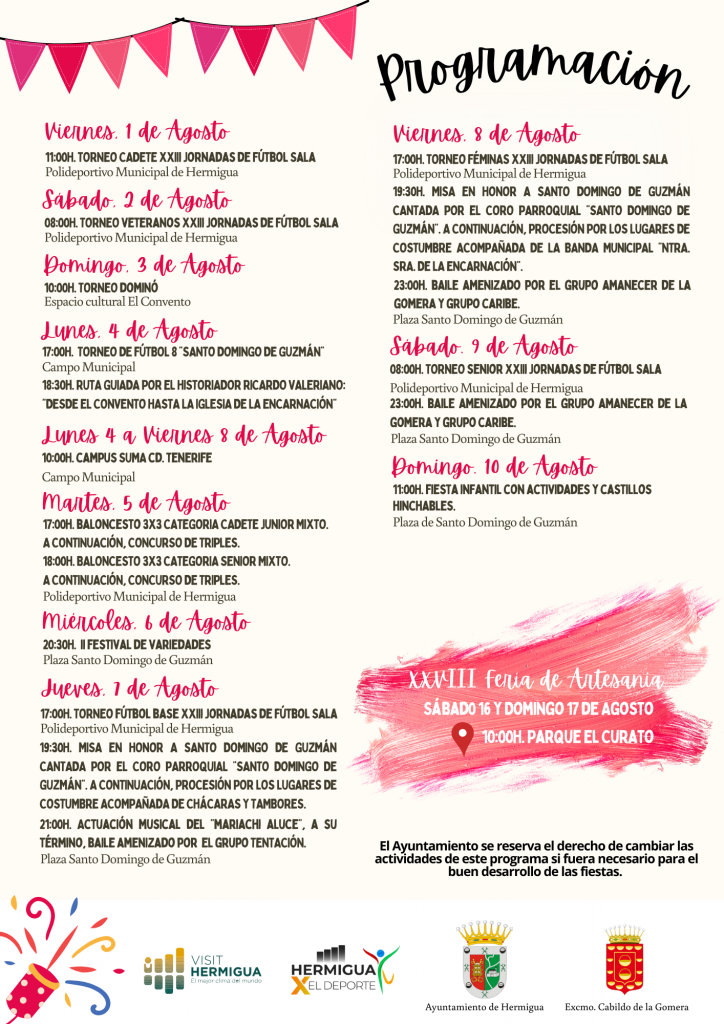 El Ayuntamiento de Hermigua recuerda que desde el pasado viernes 1 de agosto se daba comienzo oficialmente a la programación de las Fiestas en honor a Santo Domingo de Guzmán, patrón del municipio.