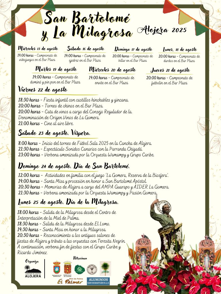 El domingo 24 de agosto, Día de San Bartolomé, comenzará con actividades familiares a las 12:00 horas, destacando el juego educativo “La Gomera, Reserva de la Biosfera”. A las 19:00 horas, se celebrará la Santa Misa y procesión en honor a San Bartolomé Apóstol. A continuación, a las 20:30 horas, se desarrollará el acto “Memorias de Alojera”, a cargo del AMPA Guarapo y AIDER La Gomera. La noche culminará a las 21:30 horas con una nueva verbena animada por la Orquesta Wamampy y Pasión Gomera.