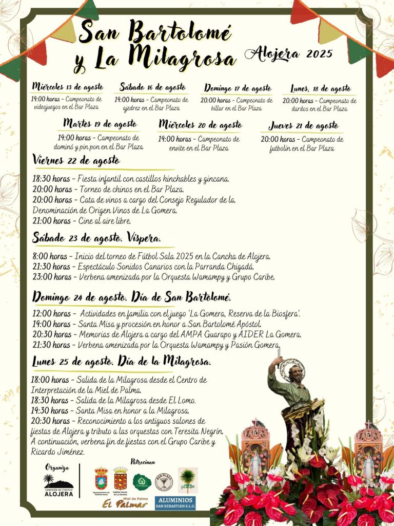 El domingo 24, Día de San Bartolomé, arrancará a las 12.00 horas con actividades en familia con el juego La Gomera, Reserva de la Biosfera. A las 19.00 horas se celebrará la misa y procesión en honor a San Bartolomé Apóstol. Posteriormente, a las 20.30 horas, se desarrollará la actividad cultural Memorias de Alojera, a cargo del AMPA Guarapo y AIDER La Gomera. El cierre de la jornada lo pondrá la verbena amenizada por la Orquesta Wamampy y Pasión Gomera a partir de las 21.30 horas.