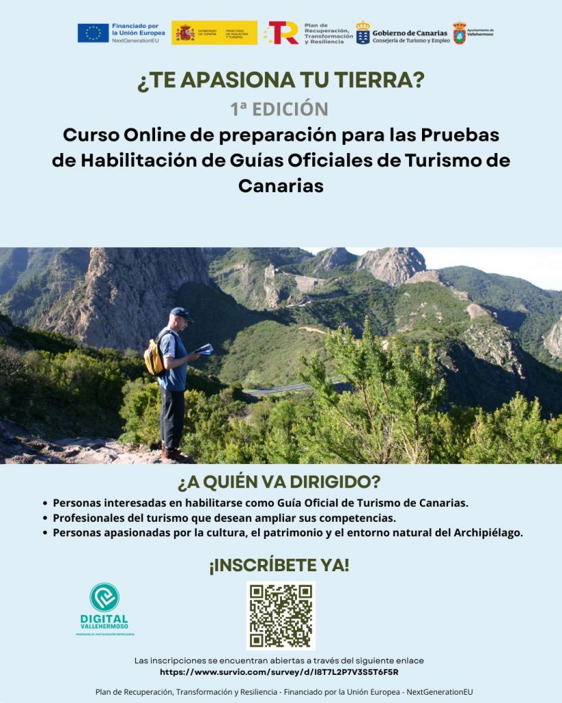 El Ayuntamiento de Vallehermoso pone en marcha una formación intensiva y completamente online de 100 horas dirigida a quienes deseen presentarse con mayores garantías a las pruebas oficiales de habilitación como Guía de Turismo de Canarias así como a profesionales del sector que busquen actualizar competencias y a personas interesadas en ampliar su conocimiento del patrimonio natural y cultural del Archipiélago.