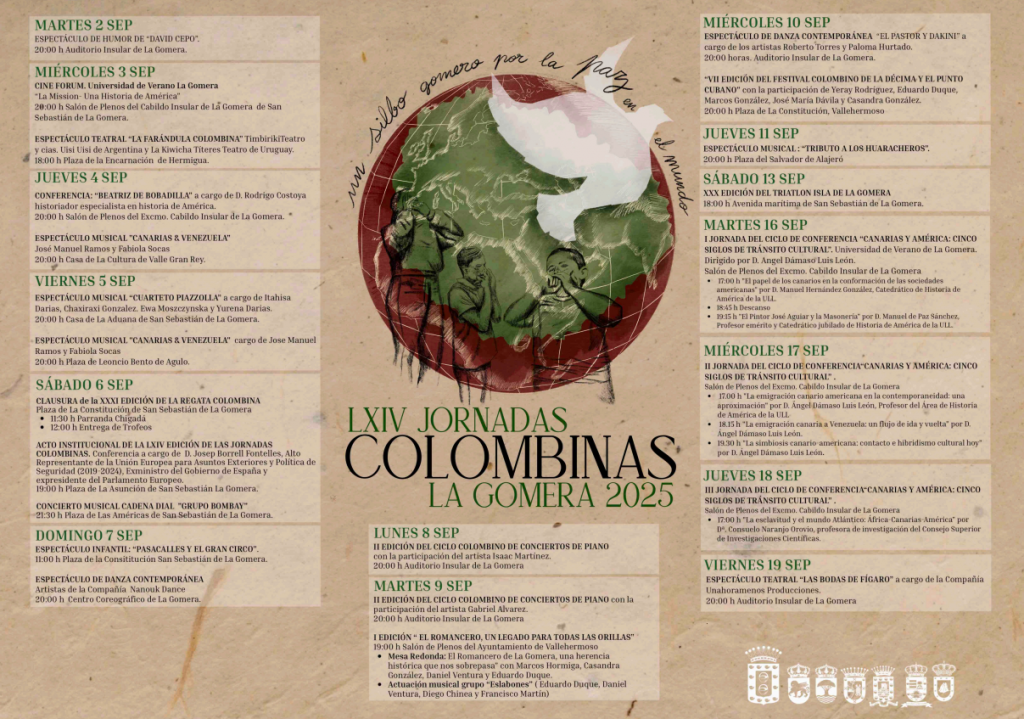 La Gomera dedica a la paz y la reflexión global la LXIV edición de las Jornadas Colombinas. El Cabildo insular presentó hoy la programación de esta nueva edición con la que, bajo el lema ‘Semillas de paz: reflexiones desde La Gomera para el mundo’, se celebrará la conmemoración anual del viaje de Cristóbal Colón hacia América.