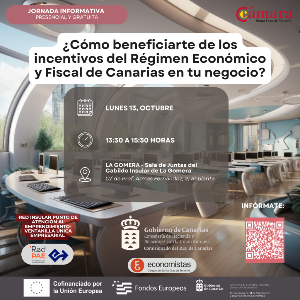 San Sebastián de La Gomera, 7 de octubre de 2025.- La Cámara Oficial de Comercio, Industria, Servicios y Navegación de Santa Cruz de Tenerife organiza, en colaboración con el Comisionado del Régimen Económico y Fiscal (REF) de Canarias y el Colegio de Economistas de la provincia, una jornada informativa sobre los incentivos del REF para las empresas de La Gomera. El encuentro ‘¿Cómo beneficiarte de los incentivos del Régimen Económico y Fiscal de Canarias en tu negocio?’, tendrá lugar el próximo lunes, 13 de octubre, de 13:30 a 15:30 horas, en la Sala de Juntas del Cabildo insular.