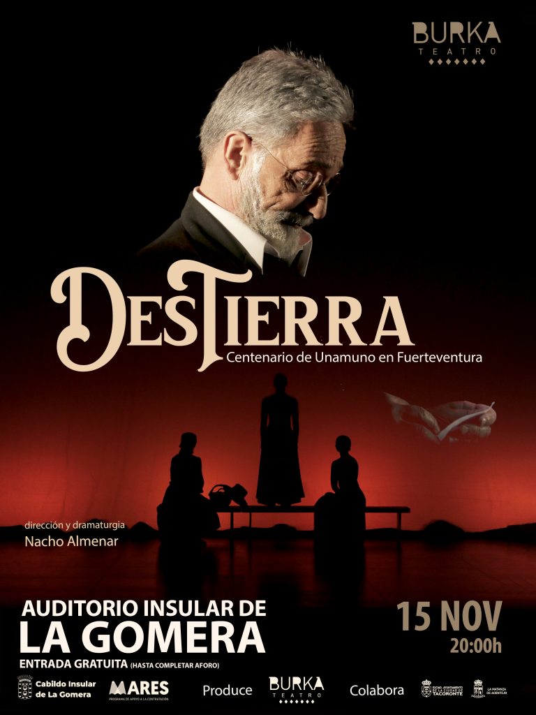 Con dramaturgia y dirección de Nacho Almenar, ‘DesTierra’ engloba música, danza y teatro utilizando como fuente la poesía y prosa de Unamuno. Vicente Ayala encarna la figura del escritor, al frente de un amplio reparto que cuenta con Lioba Herrera, Aranza Coello, Salvador Ortega, María José Torres, Sara Cabrera, Claudia Linares, Juan Carlos Baeza, Yinay de León y Antonio Robles. La coreografía corre a cargo de Charo Febles.