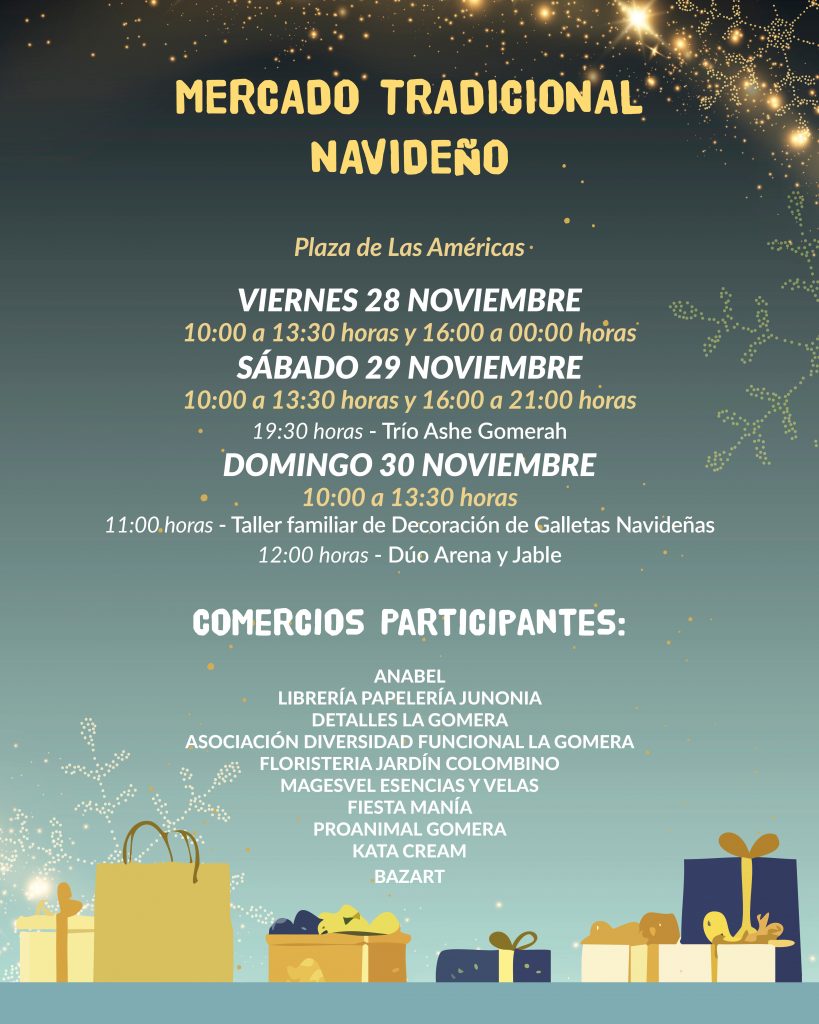 El Mercado Tradicional Navideño cuenta con la presencia de los colectivos sin ánimo de lucro como la Asociación Diversidad Funcional La Gomera y Proanimal Gomera, junto a las empresas Anabel, Librería Papelería Junonia, Detalles La Gomera, Floristería Jardín Colombino, Magesvel Esencias y Velas, Fiesta Manía, Kata Cream y BazArt.