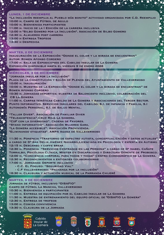 El Cabildo de La Gomera presenta el programa de actos organizado con motivo del Día Internacional de las Personas con Discapacidad, que se desarrollará del 1 al 9 de diciembre en distintos municipios de la isla. La iniciativa, impulsada por la Institución insular en colaboración con los ayuntamientos, asociaciones del Tercer Sector y colectivos sociales, tiene como objetivo promover la inclusión, sensibilizar a la ciudadanía y generar espacios de convivencia que pongan en valor la diversidad.
