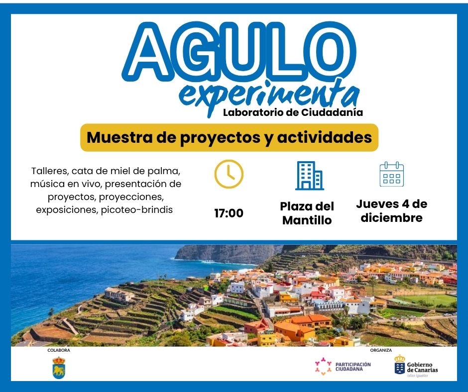 El próximo jueves 4 de diciembre, a partir de las 17:00 horas, la Plaza del Mantillo de Agulo acogerá la muestra de proyectos del laboratorio de ciudadanía Agulo Experimenta, un espacio de innovación, participación y creatividad colectiva.