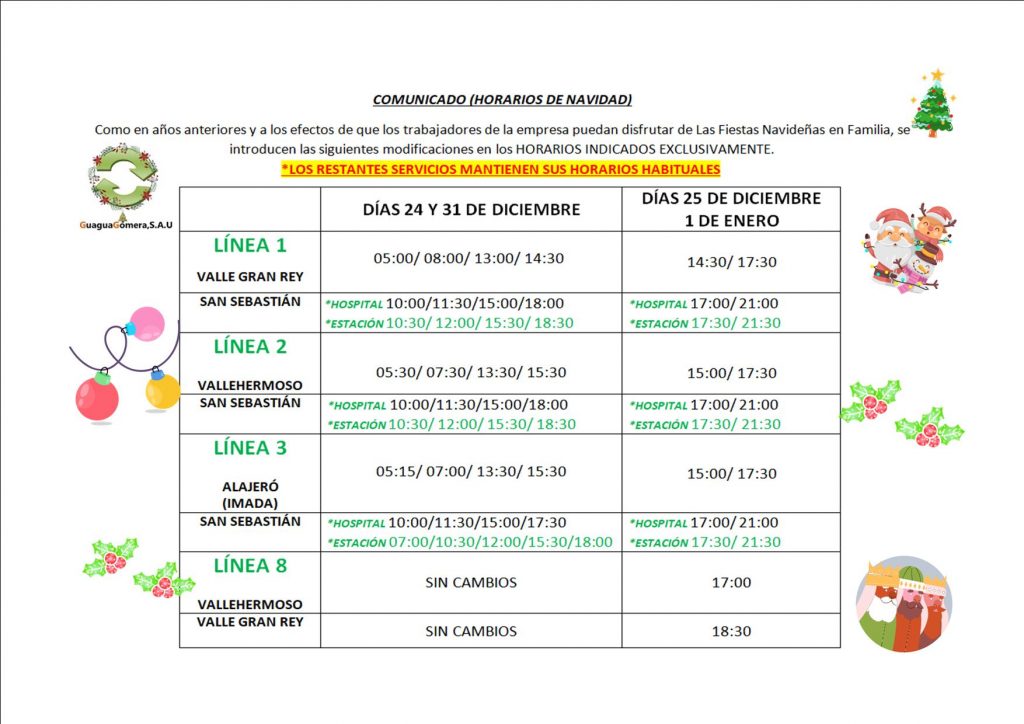 El 24 y el 31 de diciembre las salidas de la línea 1 desde Valle Gran Rey serán a las 5:00, a las 8:00, a las 13:00 y a las 18:00 horas. Mientras que desde San Sebastián será a las 10:00, a las 11:30, a las 15:00 y a las 18:00. La línea 2 sale de Vallehermoso a las 5:30 horas, a las 7:30, a las 13:30, a las 15:30. Mientras que desde San Sebastián será a las 10:00 horas, a las 11:30, a las 15:00 y a las 18:00. La línea 3 saldrá desde Imada a las 5:15 horas, a las 7:00, a las 13:30 y a las 15:30. Desde San Sebastián a las 10:00, a las 11:30, a las 15:00 y a las 17:30 horas.