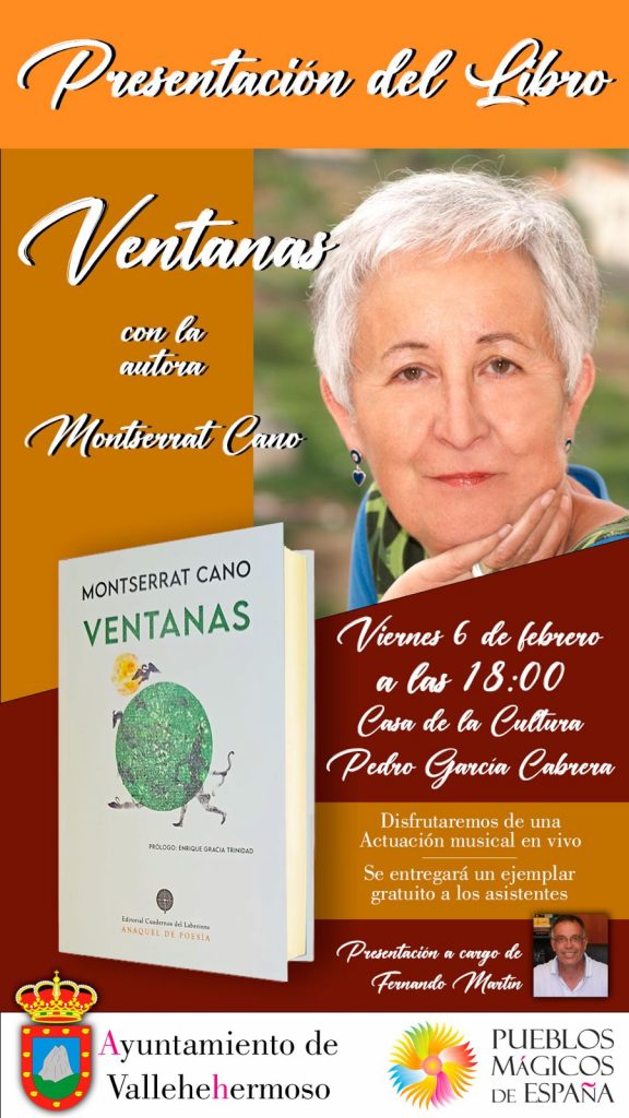 El Ayuntamiento de Vallehermoso presenta este viernes, 6 de febrero, a las 18:00 horas, en la Casa de la Cultura Pedro García Cabrera, el poemario Ventanas, de la escritora Montserrat Cano, en un acto cultural abierto al público que aunará literatura y música en directo.