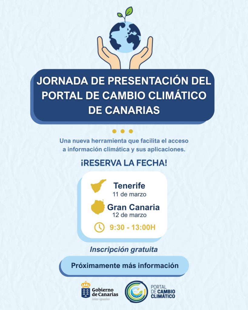 La Consejería de Transición Ecológica y Energía del Gobierno de Canarias mantiene abierta la inscripción para asistir a dos jornadas divulgativas -que se celebrarán los próximos 11 y 12 de marzo en Tenerife y Gran Canaria respectivamente- en las que se presentará su nuevo Portal de Cambio Climático y las herramientas que ha creado para facilitar el acceso a los principales proyectos científicos y de adaptación que se desarrollan actualmente en el Archipiélago.