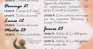 Los principales actos tendrán lugar entre los días 24 y 26 de agosto Este sábado arrancan los primeros actos de las fiestas en honor a San Bartolomé y la Milagrosa en Alojera y que se desarrollarán hasta el próximo día 26. La programación, coordinada por la Comisión de Fiestas, cuenta con la colaboración del Ayuntamiento de Vallehermoso y el Cabildo …