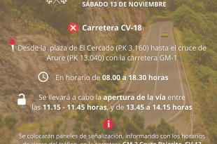 LeerEl Cabildo informa de cortes en la carretera CV-18 de El Cercado con la GM-1 en el Cruce de Arure