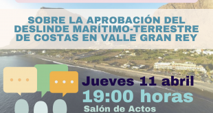 La reunión se llevará a cabo el jueves, 11 de abril, en el Salón de Actos de la Casa de La Cultura, a partir de las 19:00 horas El Ayuntamiento de Valle Gran Rey ha anunciado la convocatoria de una reunión informativa tras la aprobación por la Dirección General de la Costa y el Mar del Ministerio para la Transición …