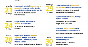 La programación se inicia este viernes 20 de mayo, en el Auditorio Insular, con el espectáculo ‘El baile de antaño’, y el sábado 21, con ‘Un canto a la Igualdad’, en el municipio de Vallehermoso Los actos, que tendrán carácter itinerante por las diferentes localidades de la isla, continuarán la próxima semana, y se prolongarán hasta el 2 de junio …