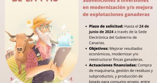 Esta línea de ayuda del Plan Estratégico de la PAC es gestionada por el Gobierno de Canarias y está dotada con 9,08 millones de euros Los titulares de explotaciones ganaderas de las islas disponen hasta el 24 de junio para solicitar las subvenciones destinadas a inversiones en modernización y/o mejora de sus fincas del Plan Estratégico de la Política Agrícola …