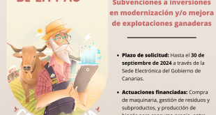 Estos fondos, gestionados por la Consejería de Agricultura, Ganadería, Pesca y Soberanía Alimentaria del Gobierno de Canarias y cofinanciados por el FEADER, la Comunidad Autónoma y el Estado, permiten acometer actuaciones como la compra de maquinaria, la gestión de residuos y subproductos, la producción de biogás para consumo propio, la instalación de equipos y sistemas de seguridad y control, y mejoras …